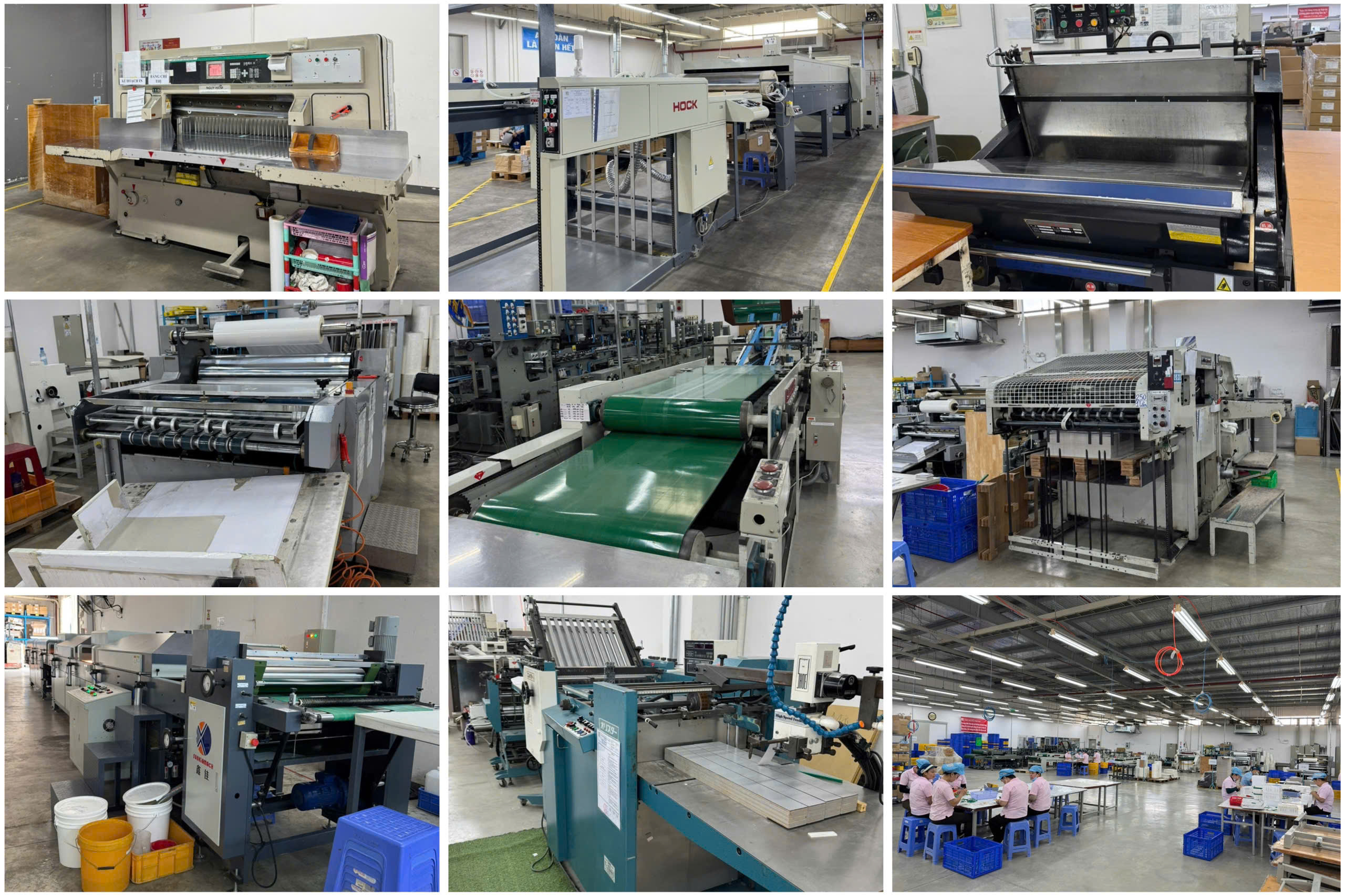 Từ khâu in cho đến các công đoạn sau in như: tráng phủ, cắt thành phẩm, cán màng, bồi, bế, ép kim, tráng gương, đều trang bị đầy đủ máy móc, thiết bị.